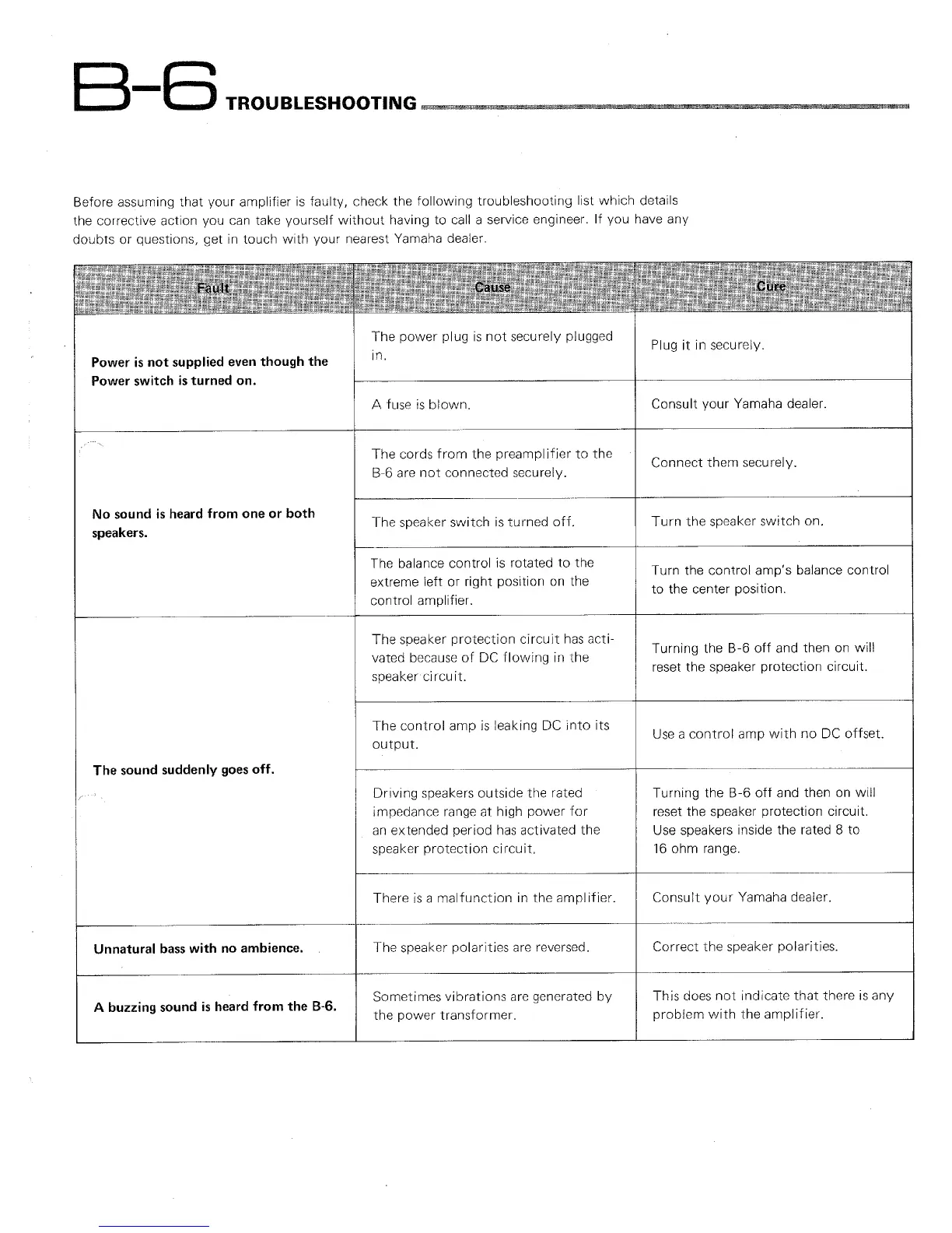 Yamaha B-6 - Troubleshooting Common Issues; Faults, Causes, and Solutions