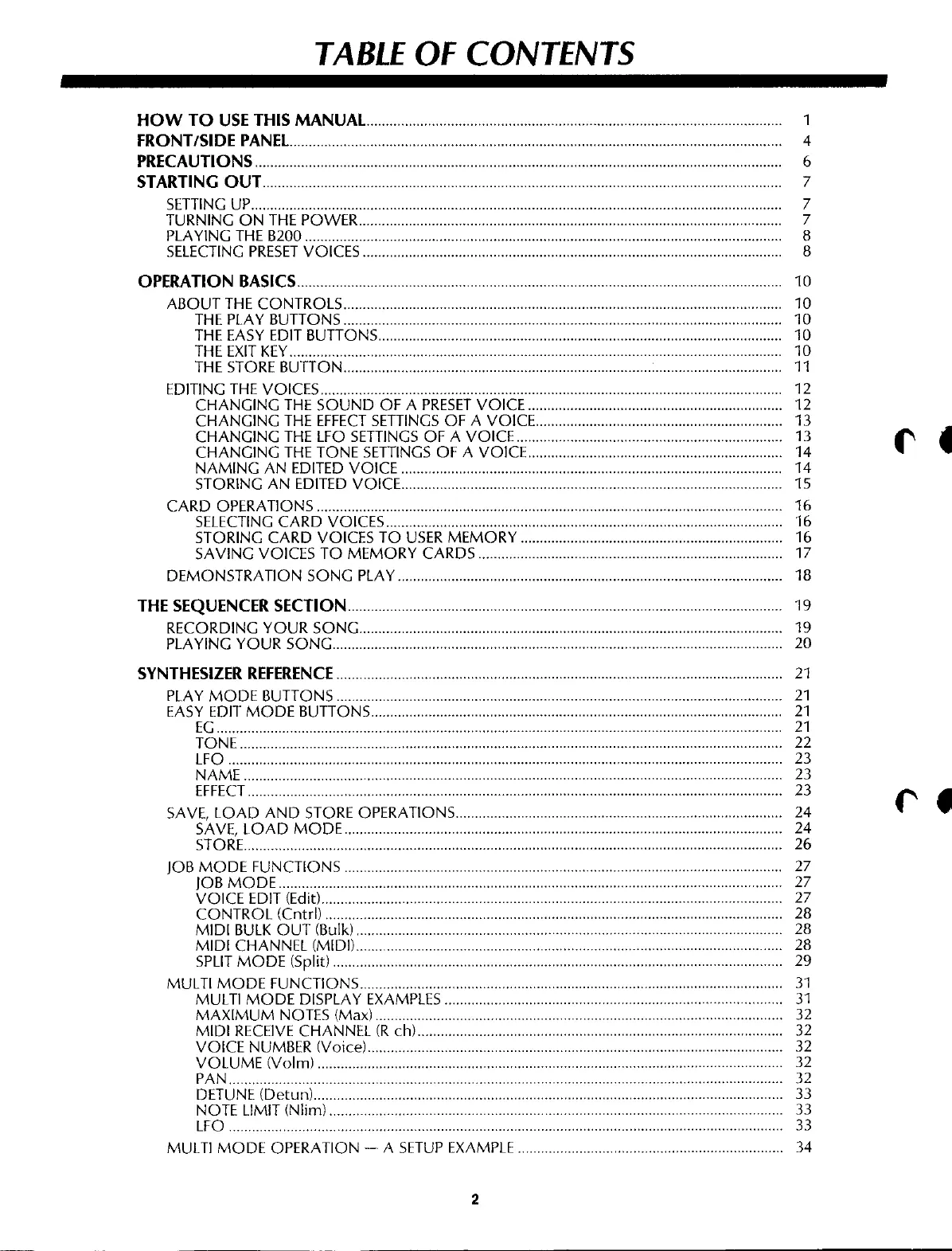 Yamaha B200 - Table of Contents
