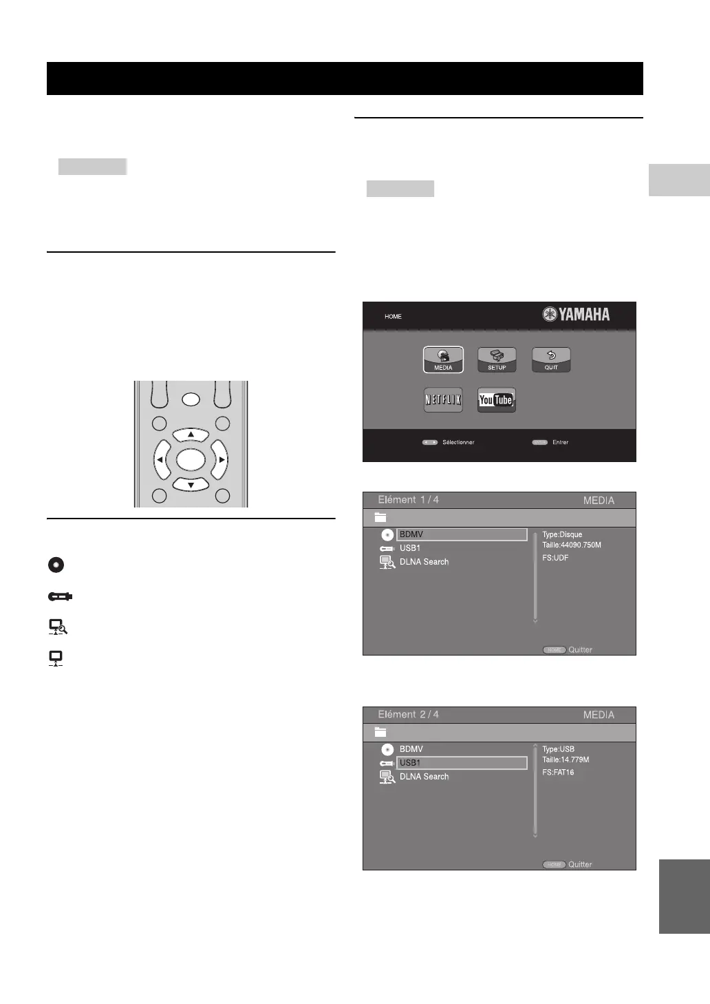 Les menus HOME et MEDIA permettent de passer en