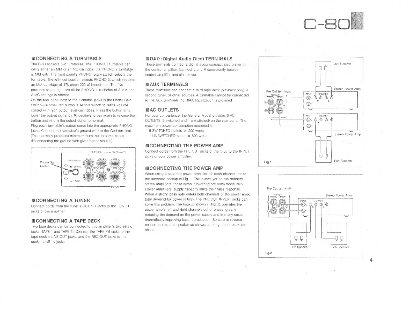 Yamaha C-80 - Turntable Connection Guide; Tuner and Tape Deck Connections; Digital Audio & AUX Terminal Connections; Power Amplifier Hookup Options