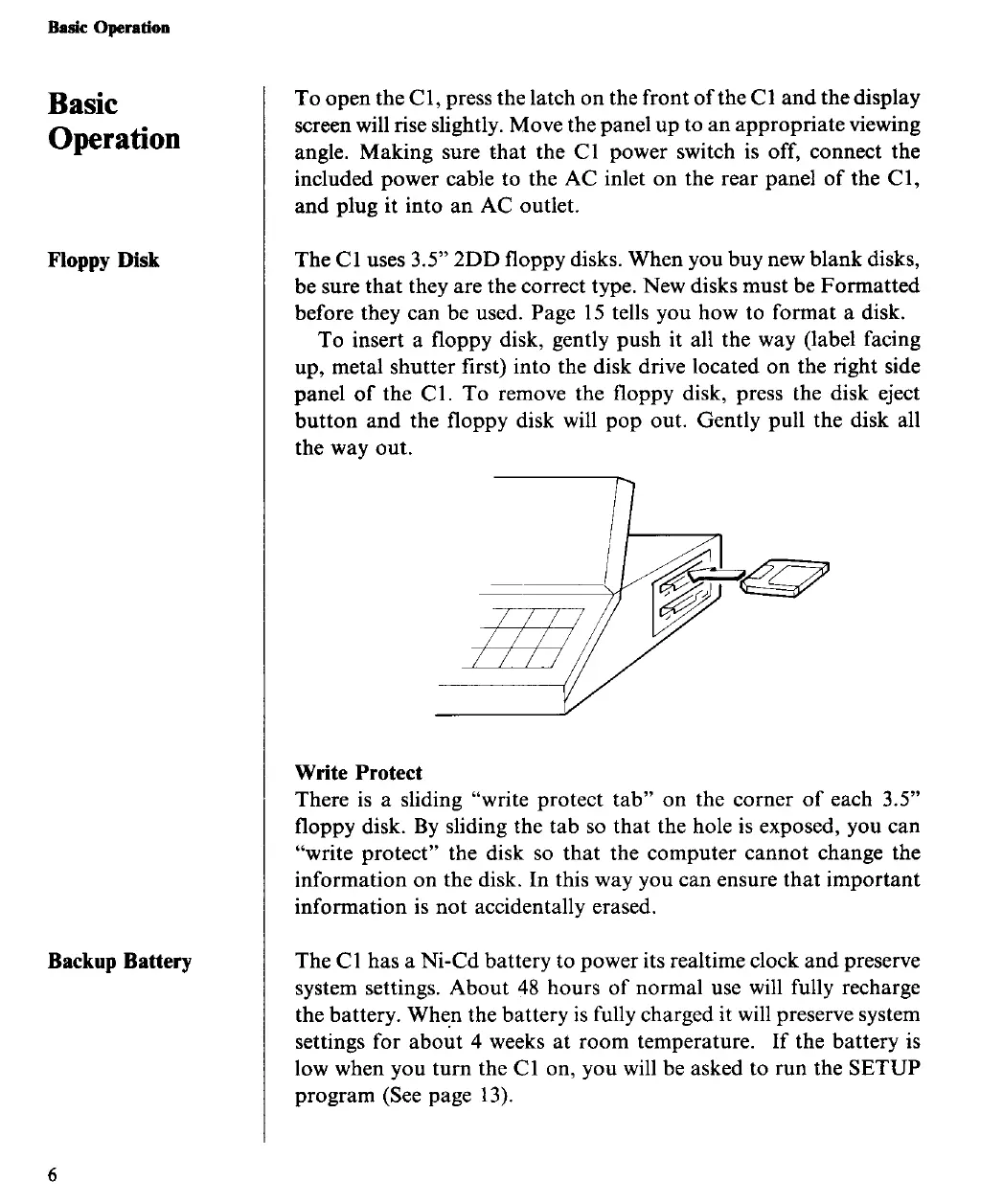 Yamaha C1 - Basic Operation; Floppy Disk Usage; Floppy Disk Write Protection; Backup Battery Function