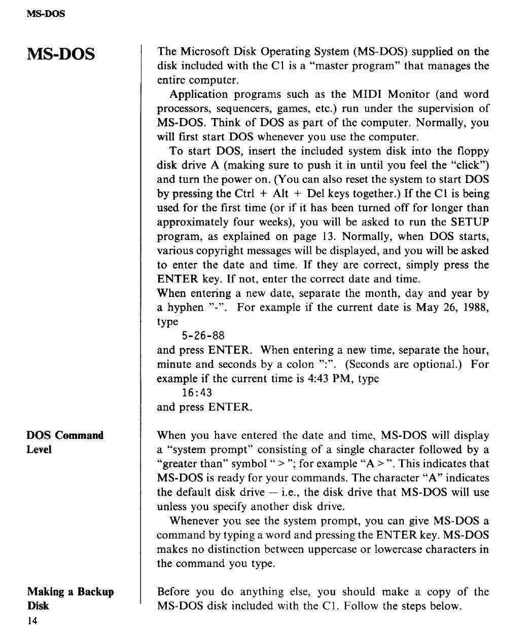 Yamaha C1 - MS-DOS Operating System; MS-DOS Introduction; MS-DOS Command Level; Creating an MS-DOS Backup Disk