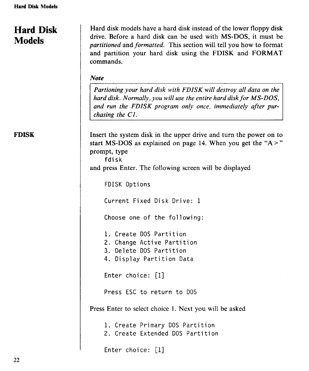Yamaha C1 - Hard Disk Models; Hard Disk Model Overview; Using FDISK for Hard Disk Partitioning