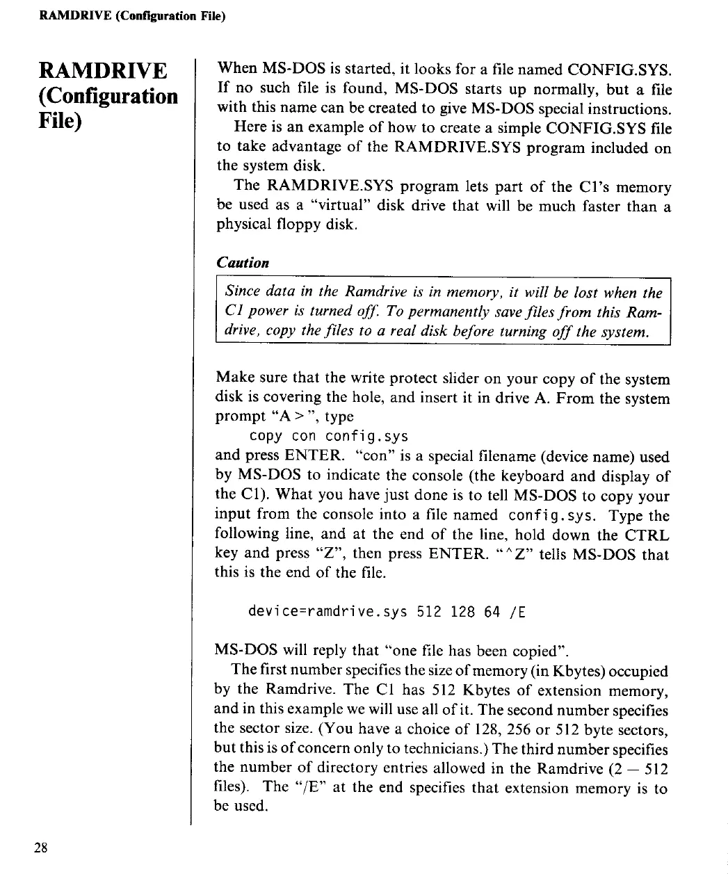 Yamaha C1 - RAMDRIVE Configuration File; Introduction to RAMDRIVE.SYS; RAMDRIVE Data Loss Caution