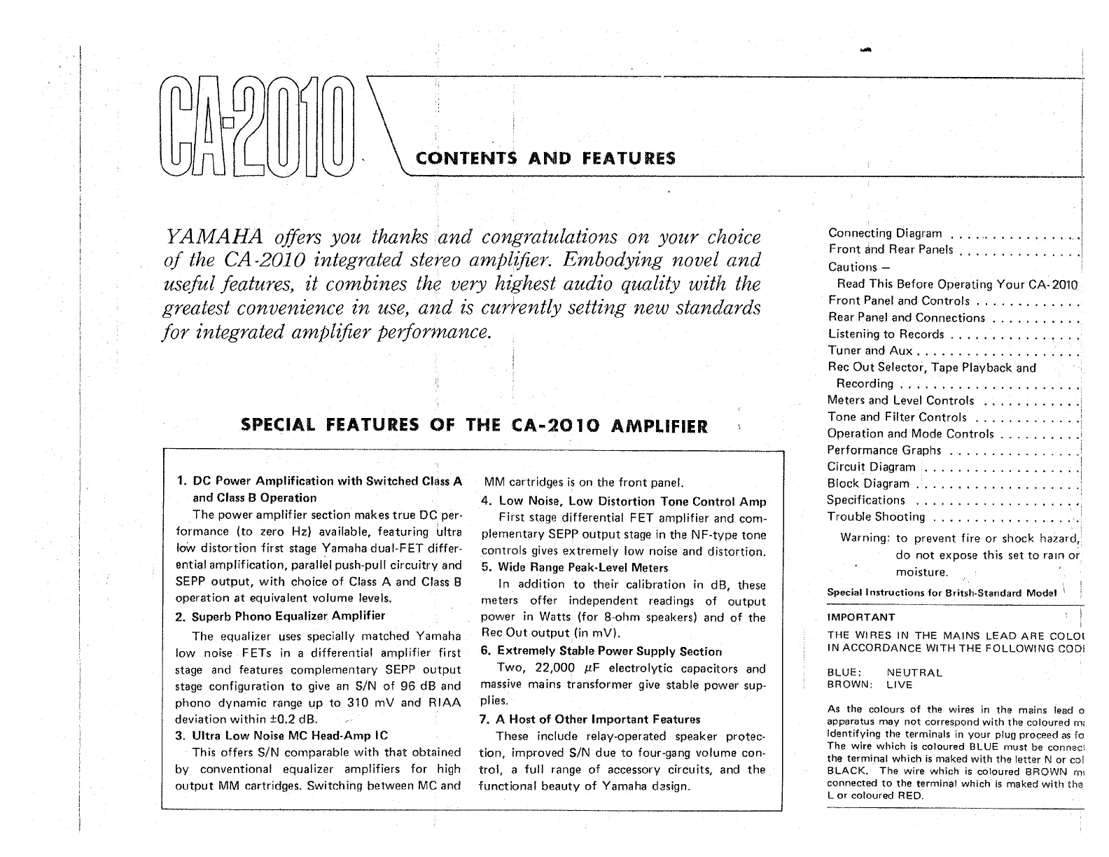 Yamaha CA-2010 - Contents and Features; Special Features of the CA-2010 Amplifier
