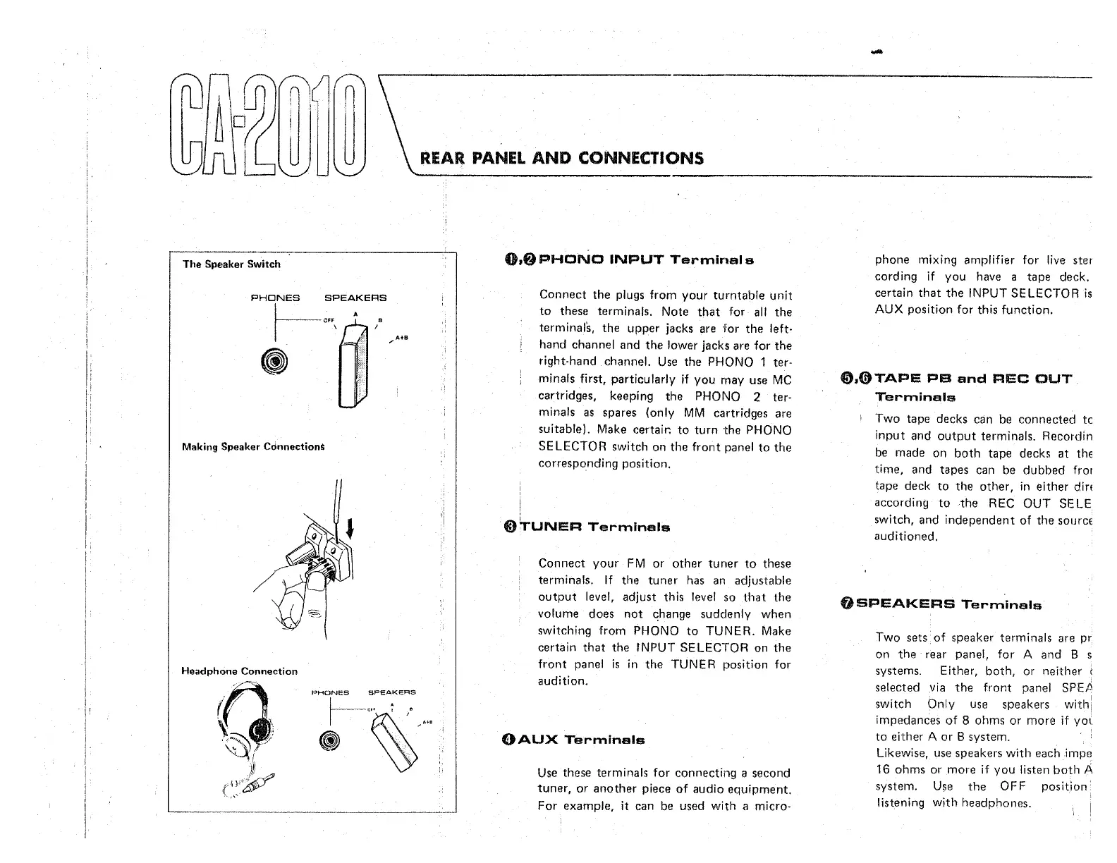 Yamaha CA-2010 - Rear Panel Connections and Terminals; Speaker and Input Terminal Connections