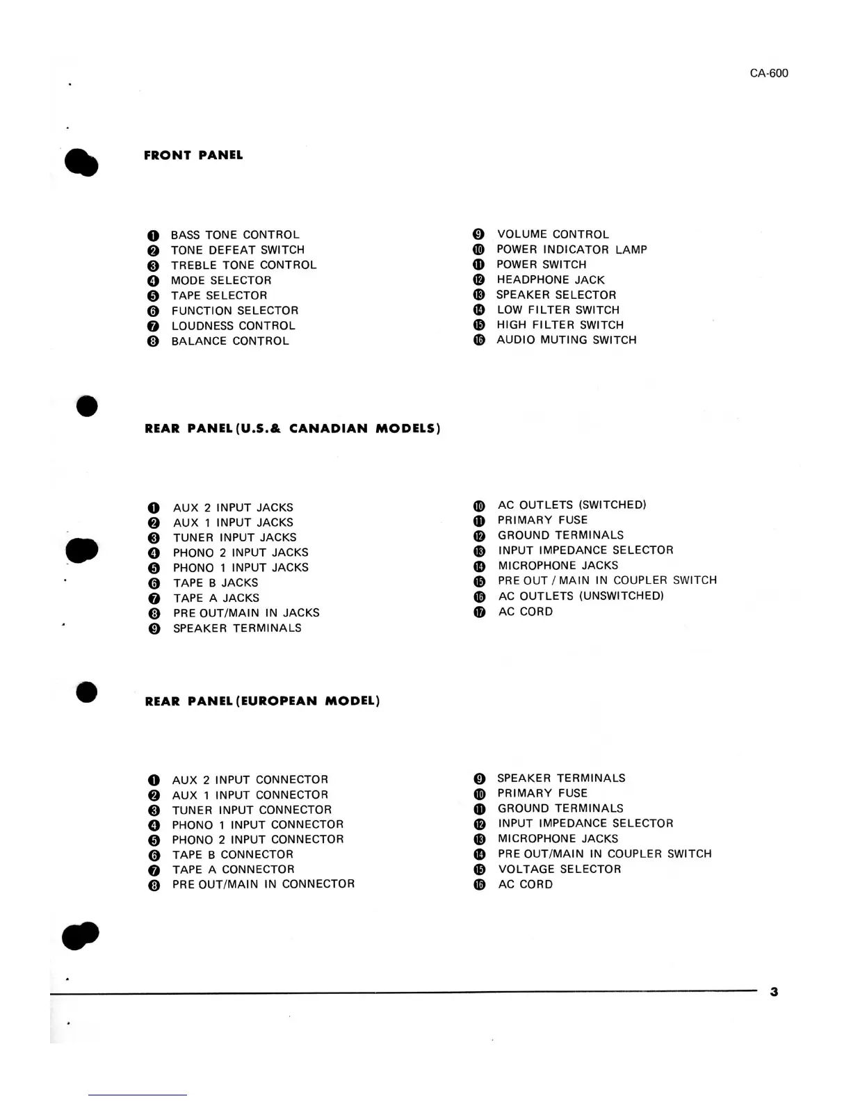 Yamaha CA-600 - Front Panel Components; Rear Panel Connectors (US;Canadian); Rear Panel Connectors (European)