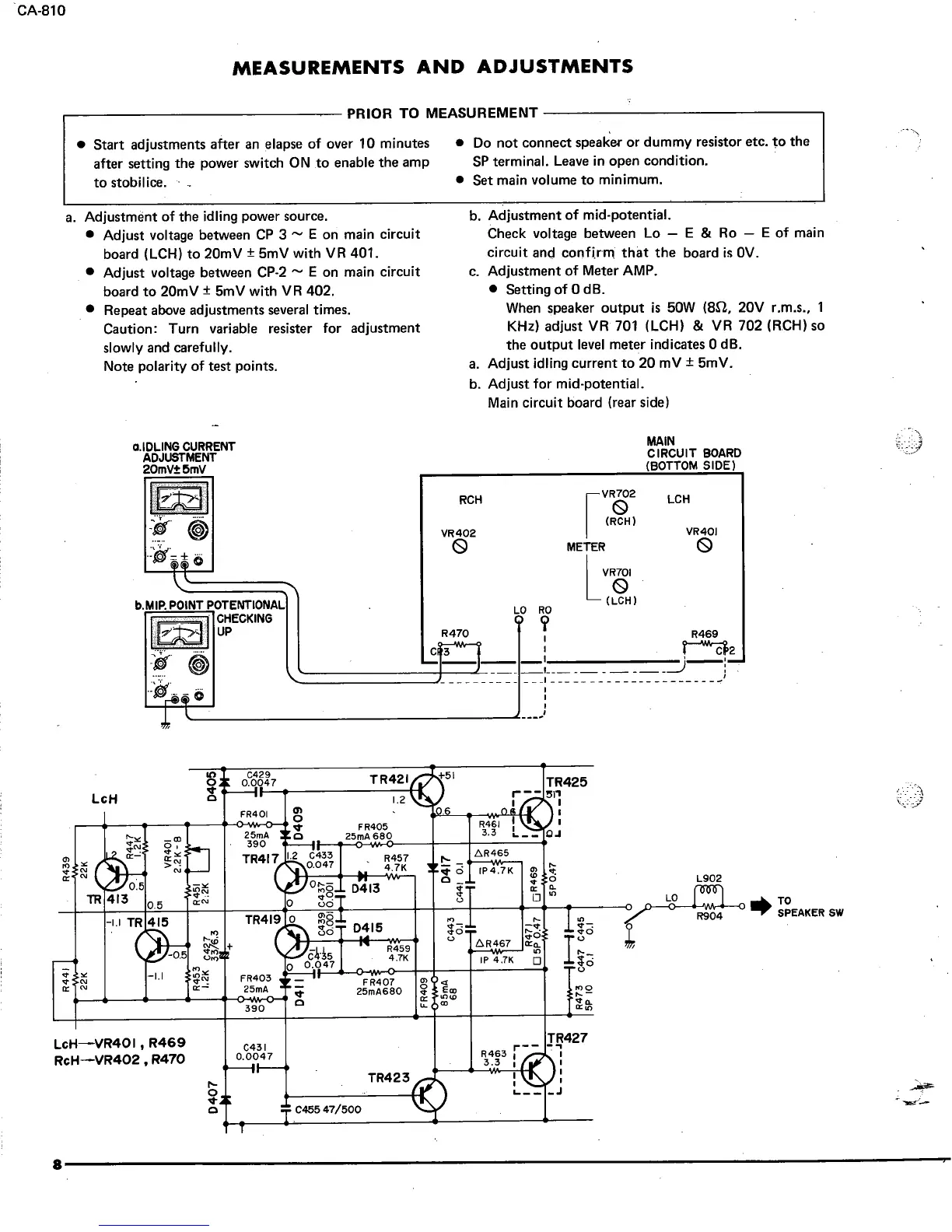 Yamaha CA-810 - Measurements and Adjustments; Prior to Measurement; Idling Current Adjustment; Mid-Point Potential Adjustment