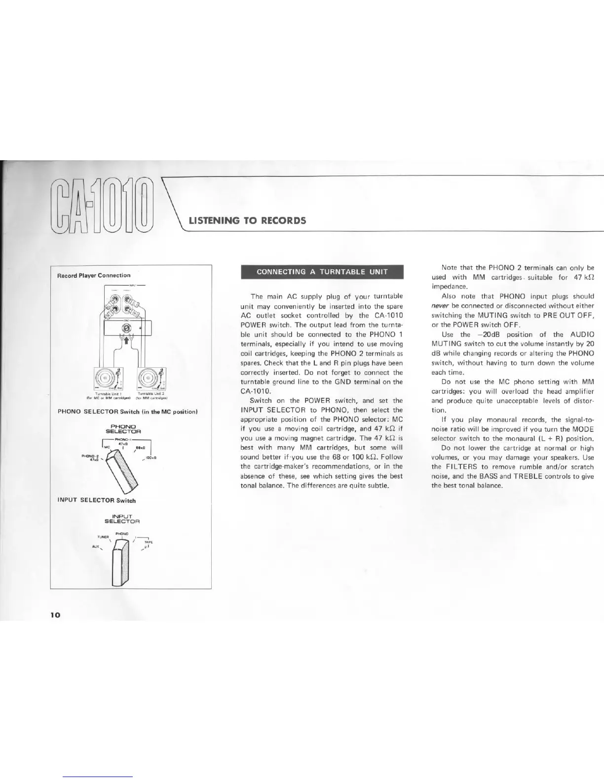 Yamaha CA1010 - Listening to Records; Turntable Connection and Operation