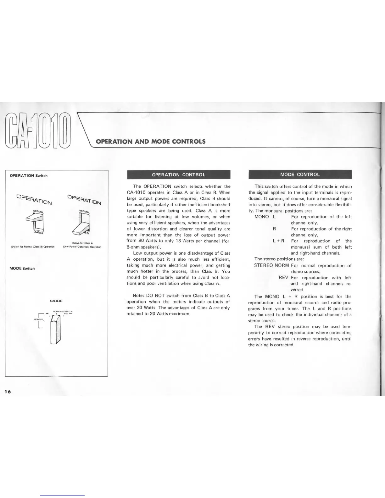 Yamaha CA1010 - Operation and Mode Controls; Operation Mode Selection (Class A;B); Audio Signal Mode Selection