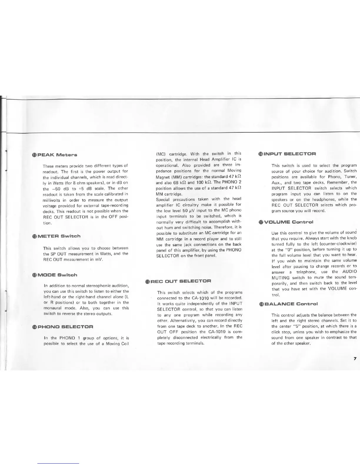 Yamaha CA1010 - Front Panel Controls - Part 2; Peak Meters and Meter Switch; Mode, Phono, Input, and REC OUT Selectors; Volume and Balance Controls