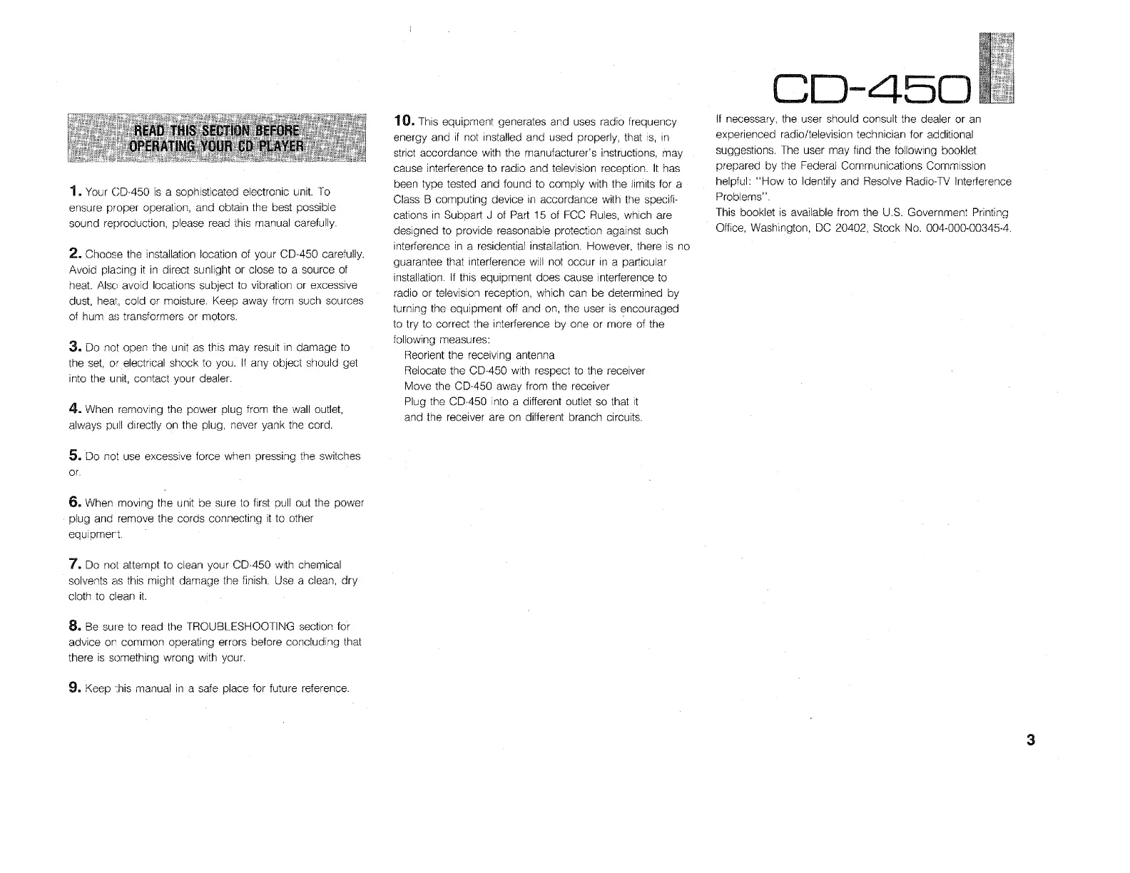 Yamaha CD-450 - Before Operating Your CD Player; Initial Setup and Handling; Safety and Maintenance Advice