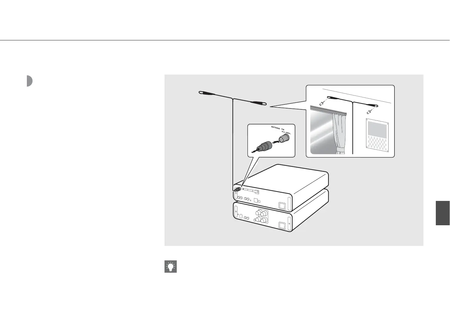 • Als de radio-ontvangst met de meegeleverde antenne onvoldoende is, dan kan een in de handel verkrijgbare