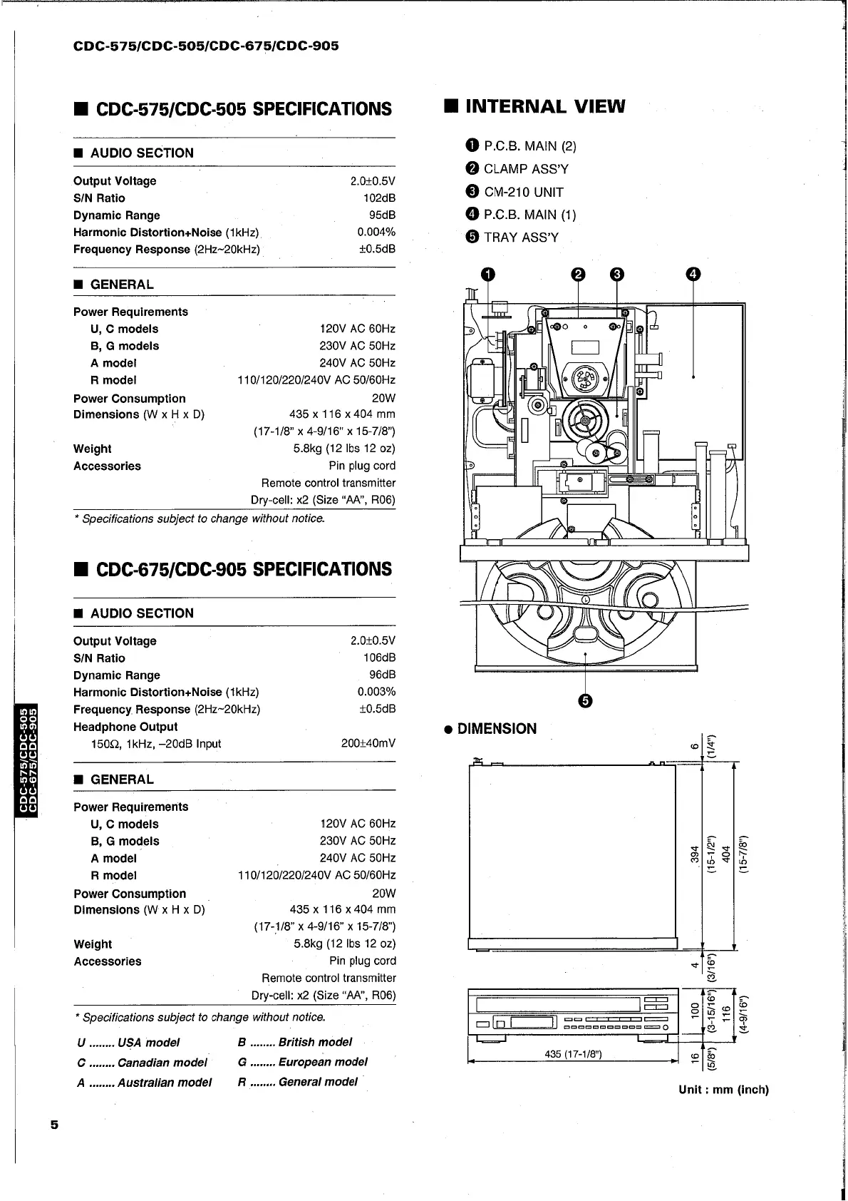 Yamaha CDC-675 - Specifications; CDC-575;CDC-505 Specifications; CDC-675;CDC-905 Specifications