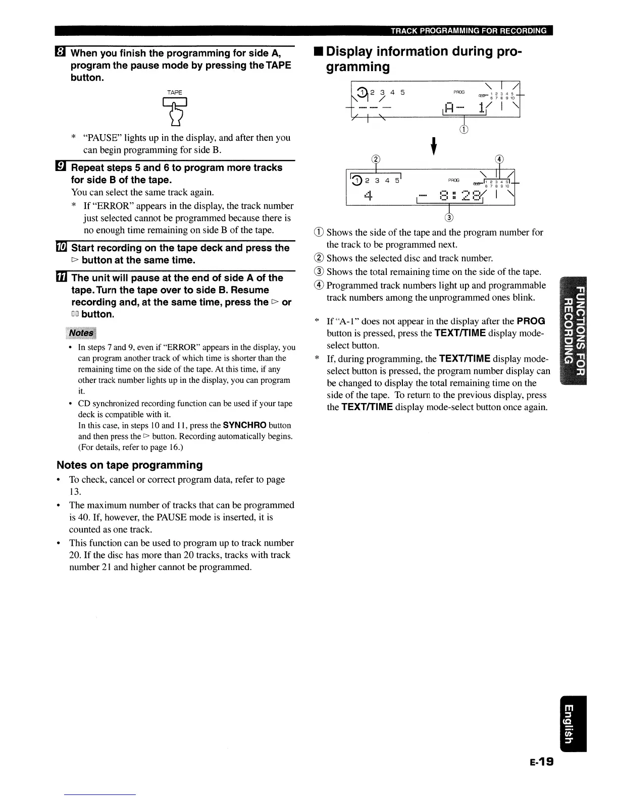 program the pause mode by pressing the TAPE