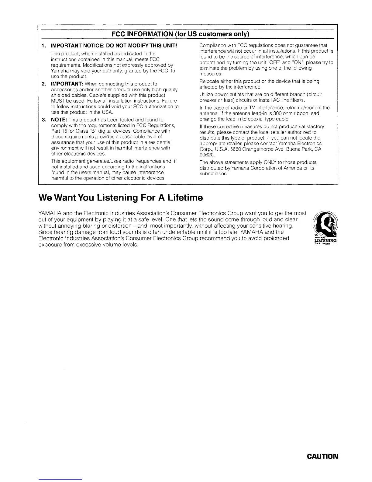 Yamaha may void your authority, granted by the FCC, to