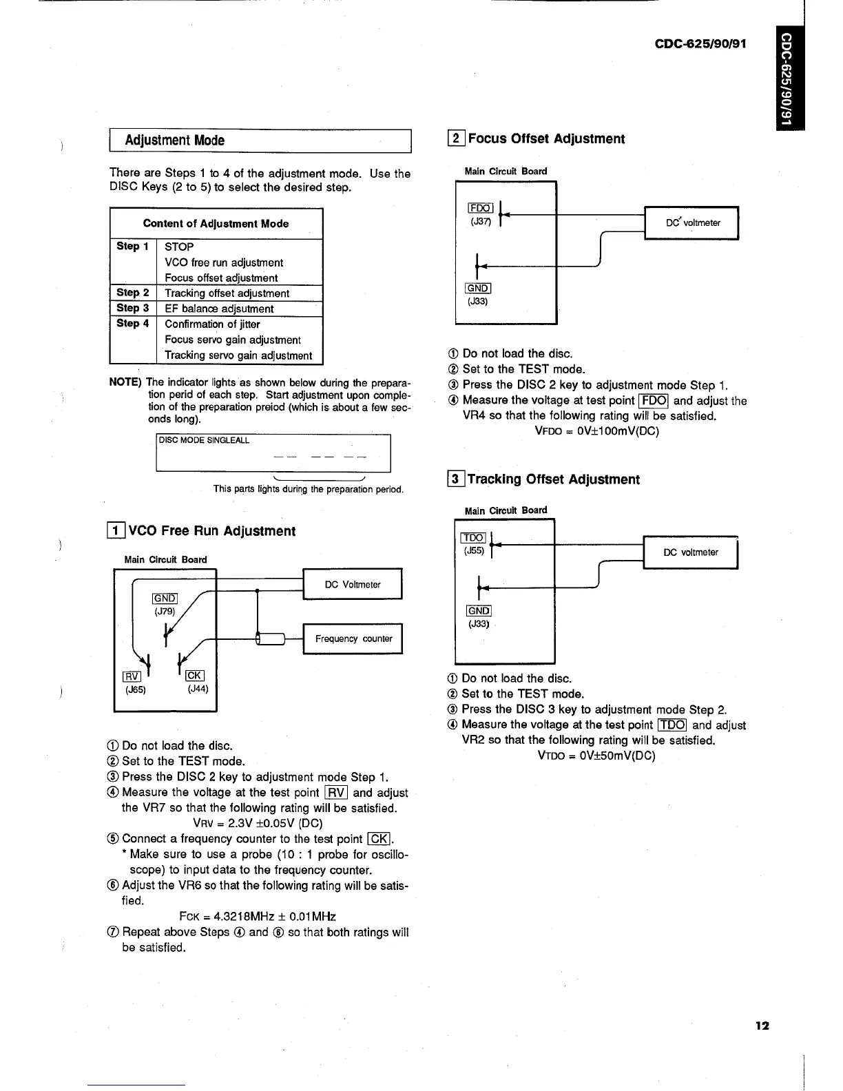 Yamaha CDC-90 - Adjustments (continued); Adjustment Mode Selection; VCO Free Run Adjustment; Focus Offset Adjustment