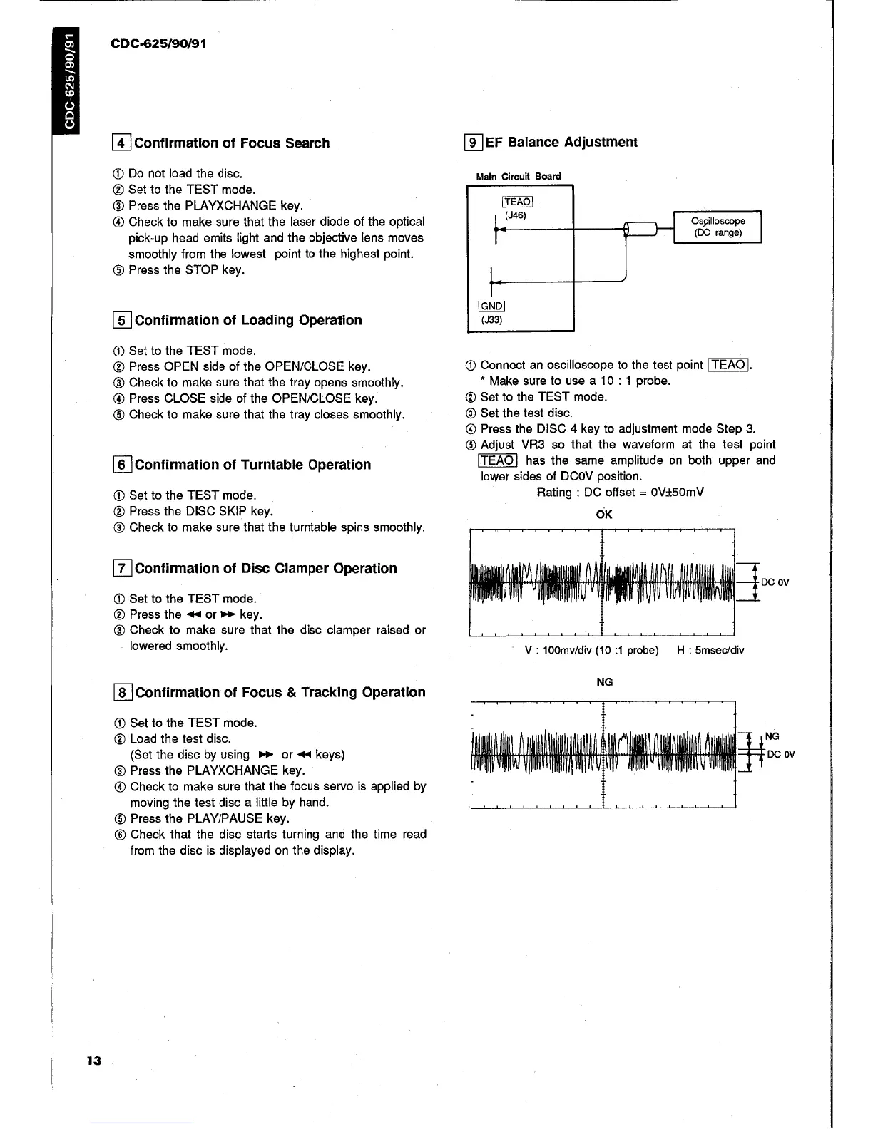 Yamaha CDC-90 - Adjustments (continued); Focus Search Confirmation; Loading Operation Confirmation; Turntable Operation Confirmation