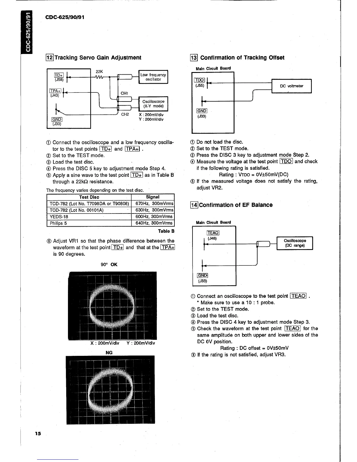 Yamaha CDC-90 - Adjustments (continued); Focus Servo Gain Adjustment; Tracking Servo Gain Adjustment; Tracking Offset Confirmation