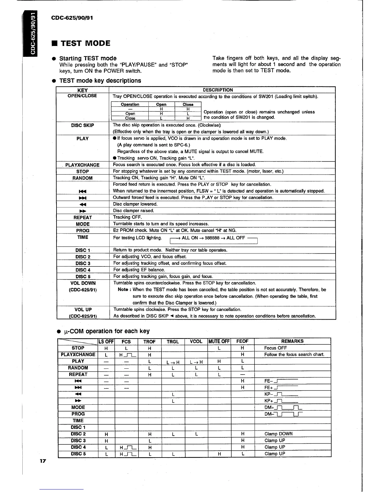 Yamaha CDC-90 - Test Mode; Starting TEST Mode; TEST Mode Key Descriptions; μ-COM Operation per Key