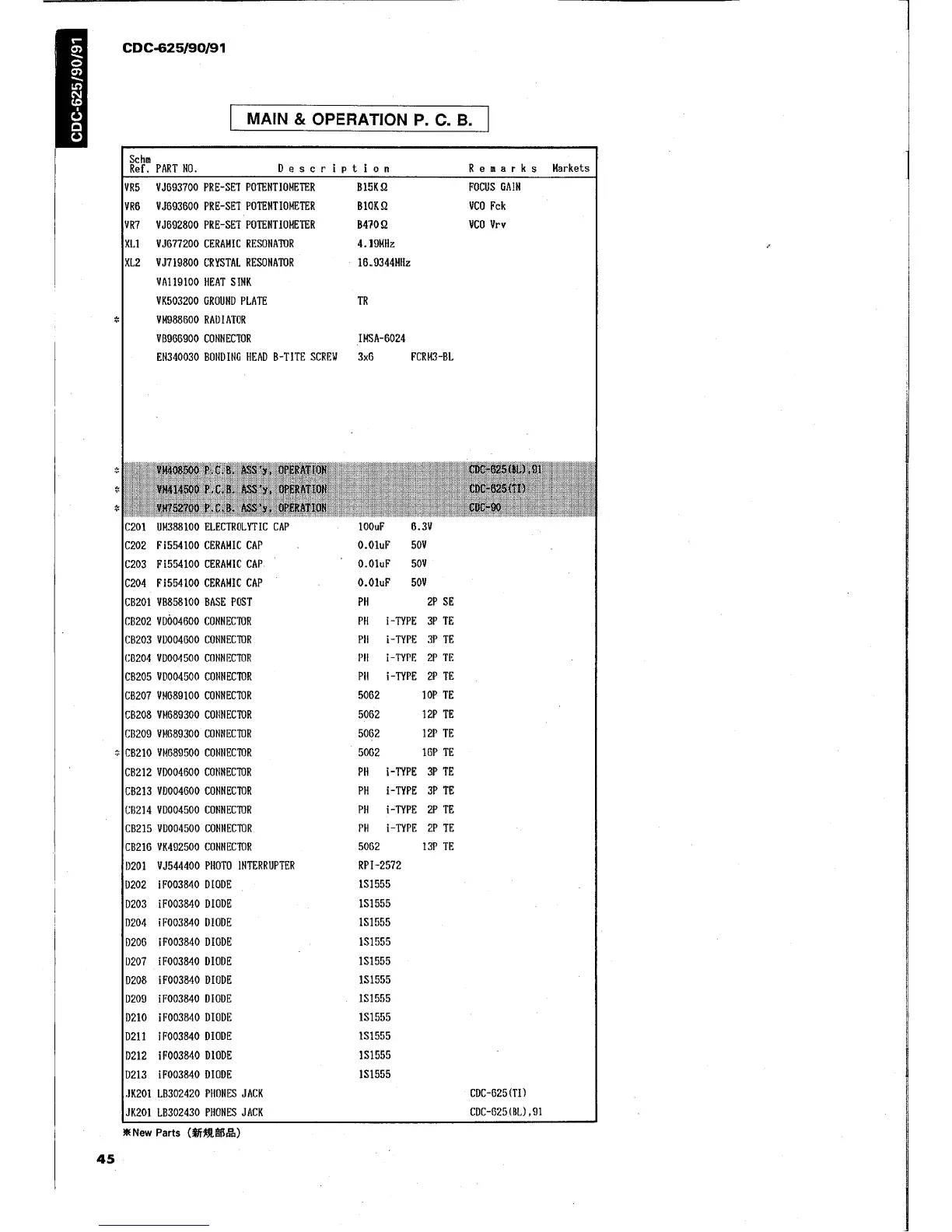 Yamaha CDC-90 - Parts List Main & Operation P. C. B.; Main & Operation PCB Components