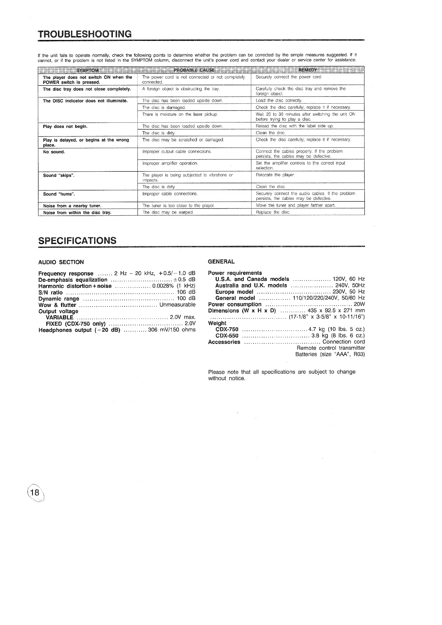 Yamaha CDX-550 - Troubleshooting; Specifications; Audio Section; General