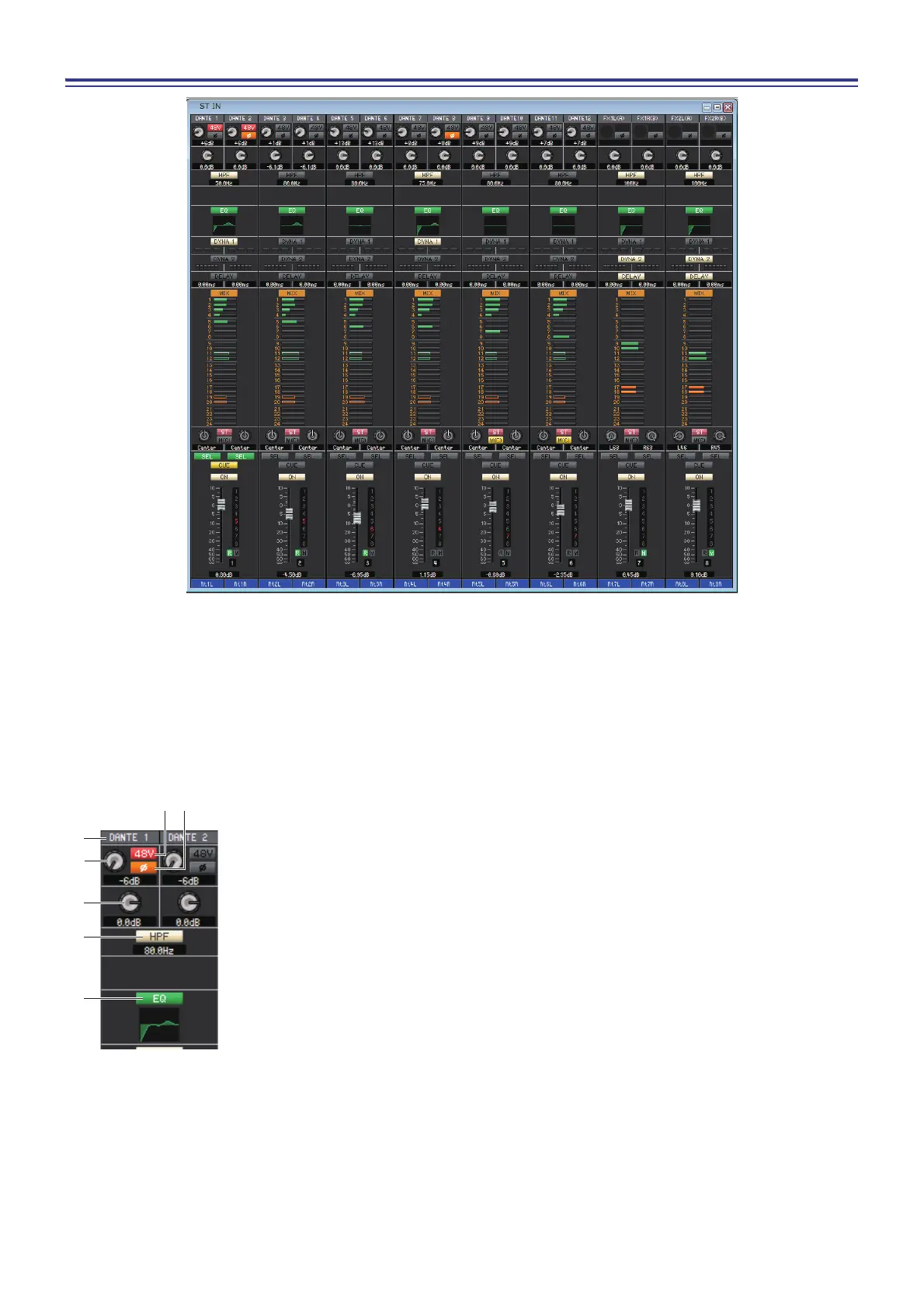 In this window you can view and edit the mix parameters of ST IN channels 1–8. The parameters shown in the window can