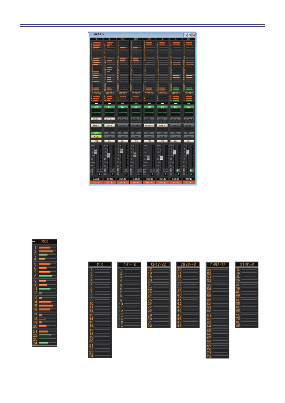 In this window you can view and edit the parameters of MATRIX channels 1–8. The parameters shown in the window can