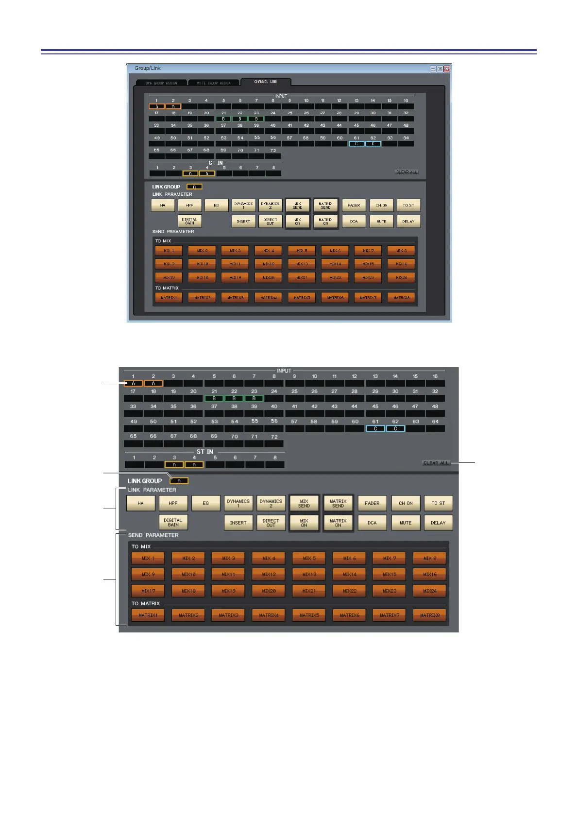 Use these buttons to select the link group A-Z, a-n to which you want each input channel to be assigned. If you don’t
