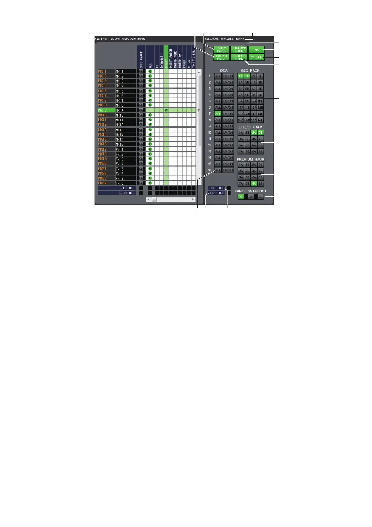 In this area you can view and edit the Recall Safe parameters. These are not channel parameters, but CL global parame-
