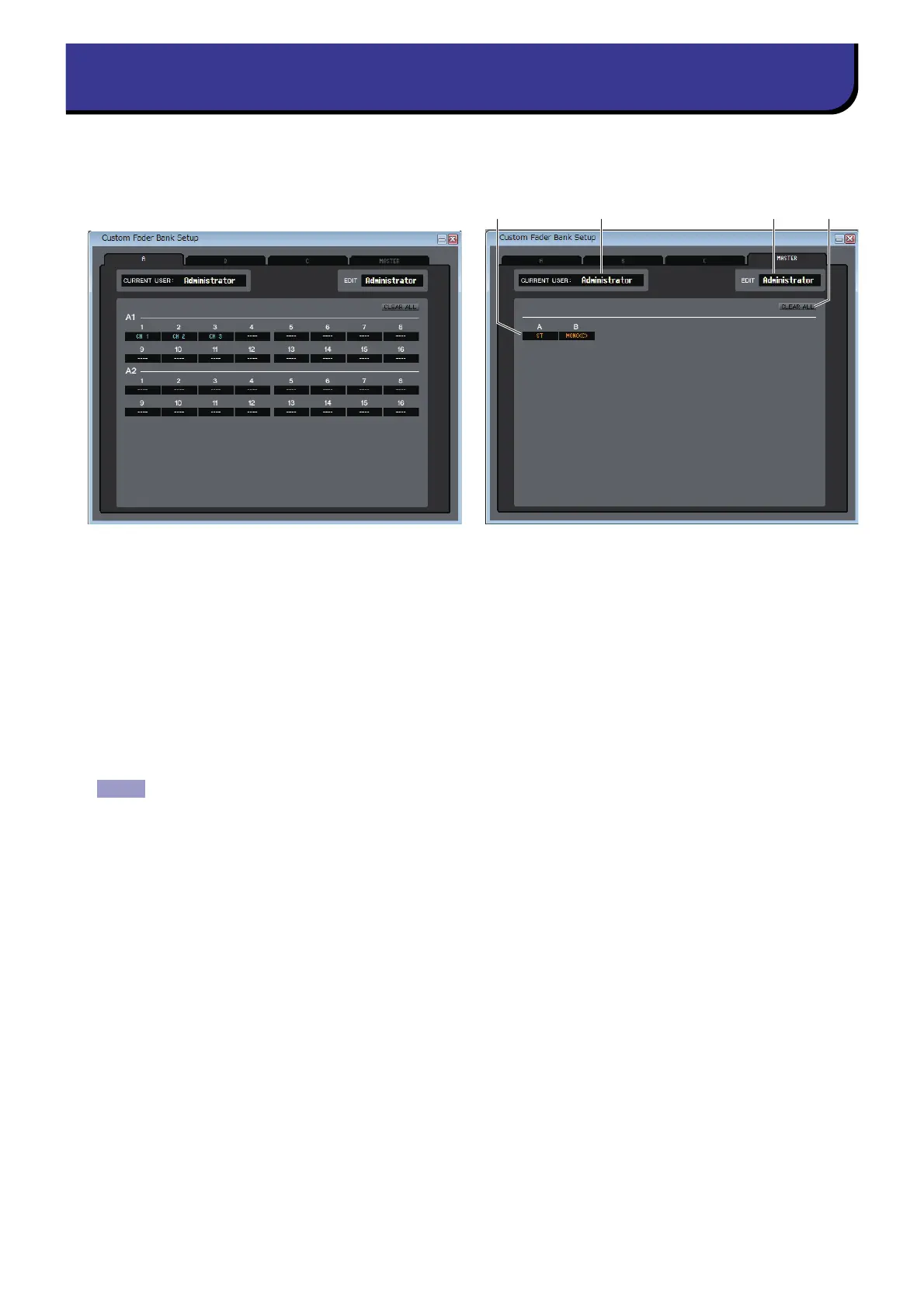 To open these pages, choose [Custom Fader Bank Setup] from [Windows] menu and click the tabs shown in the upper part