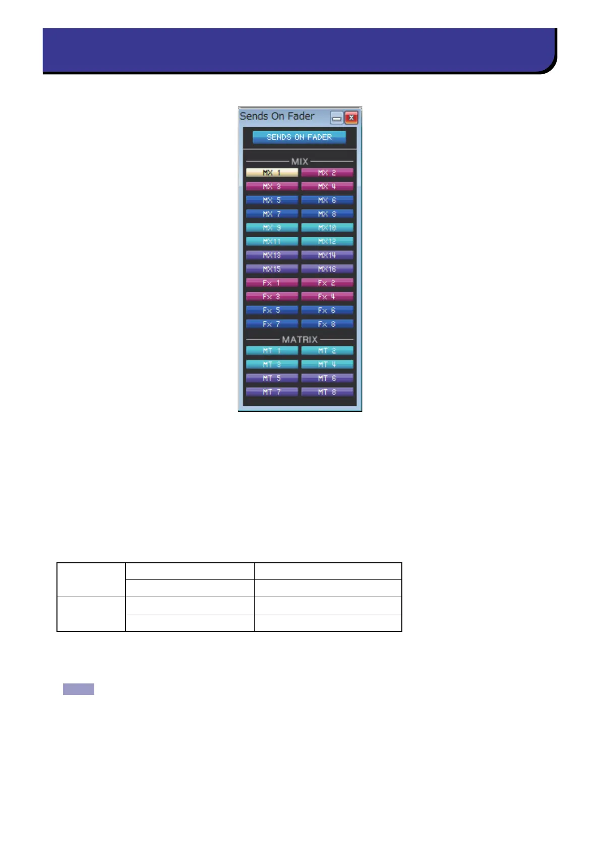 SENDS ON FADER mode enables you to adjust the send level to the MIX/MATRIX bus using the fader. In this mode, the