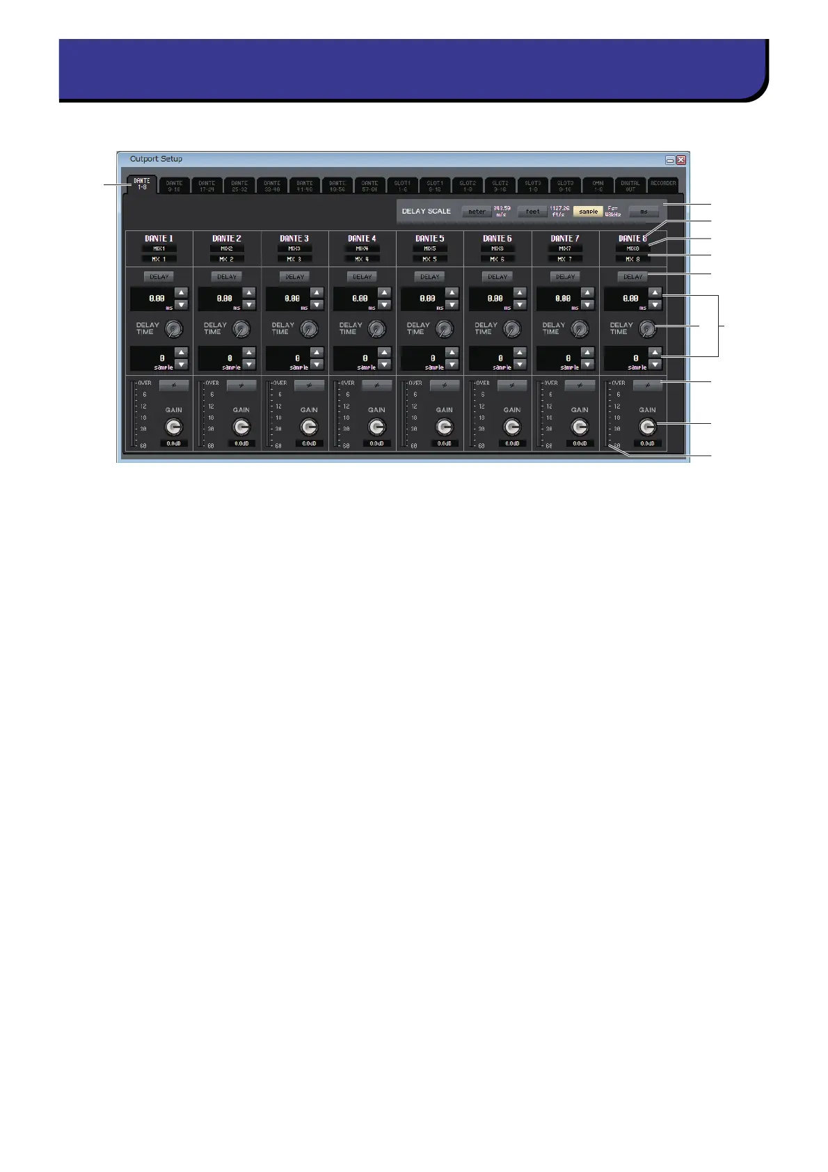These tabs switch the output ports controlled in the window in groups of up to eight ports.