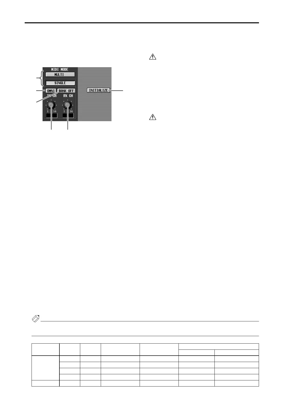 The following table shows the MIDI channels and types of message that can be transmitted/received in Single mode
