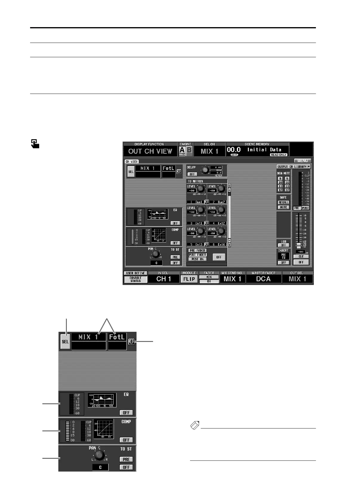 View the settings of the currently selected MIX channel, MATRIX channel, or STEREO A/B channel. In this