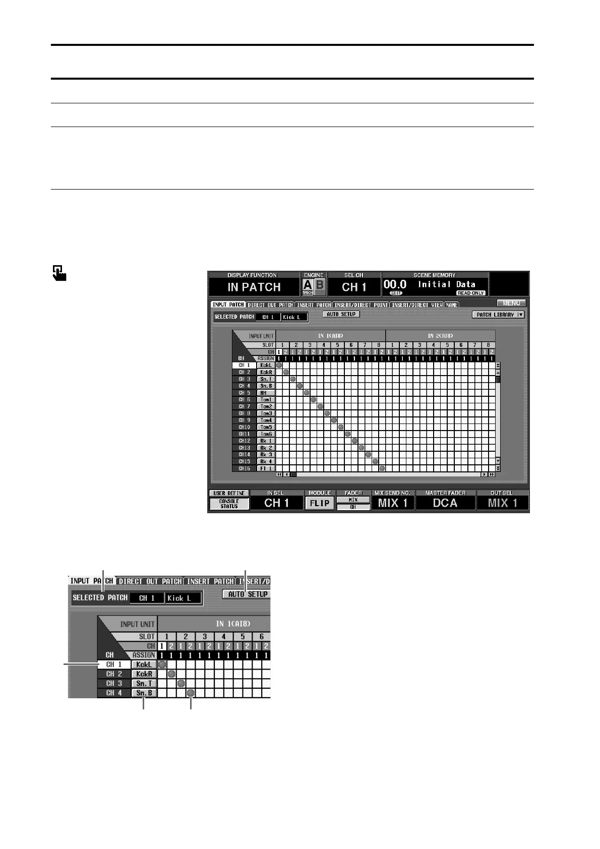 Patch the input jacks of the input units, 2TR IN jacks, effect returns, and talkback to the desired input channel