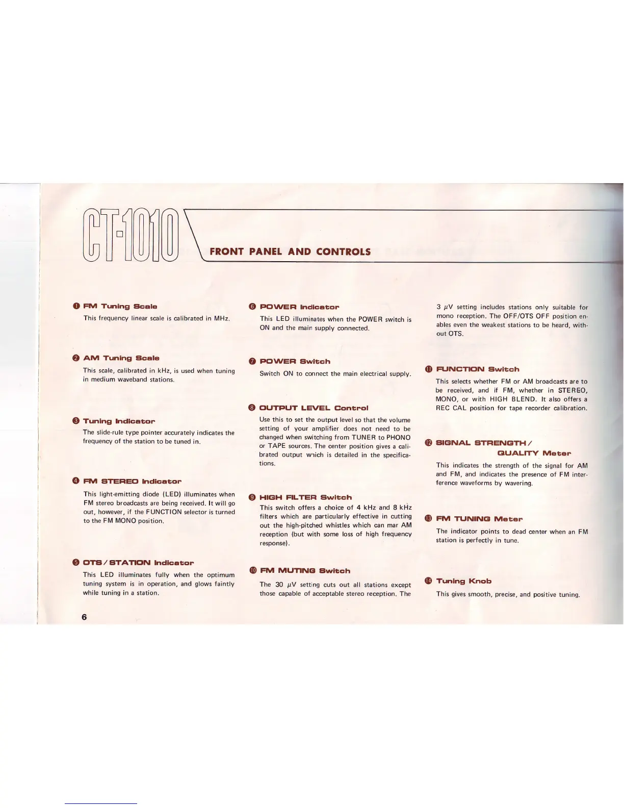 Yamaha CT-1010 - Front Panel Controls and Indicators; Tuning Scales and Indicators; Operational Switches; Adjustment Controls