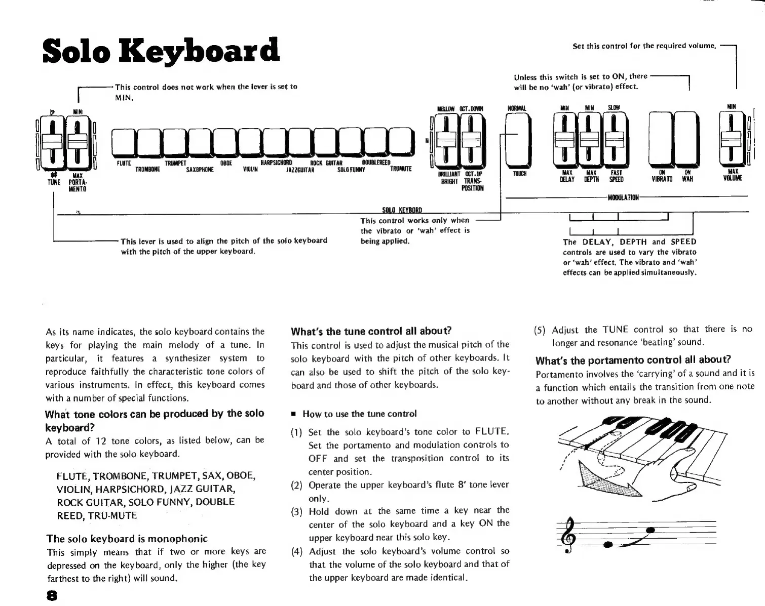 Yamaha D-85 - Solo Keyboard Functions; Solo Keyboard Tone Colors; Monophonic Nature; Tune and Portamento Controls