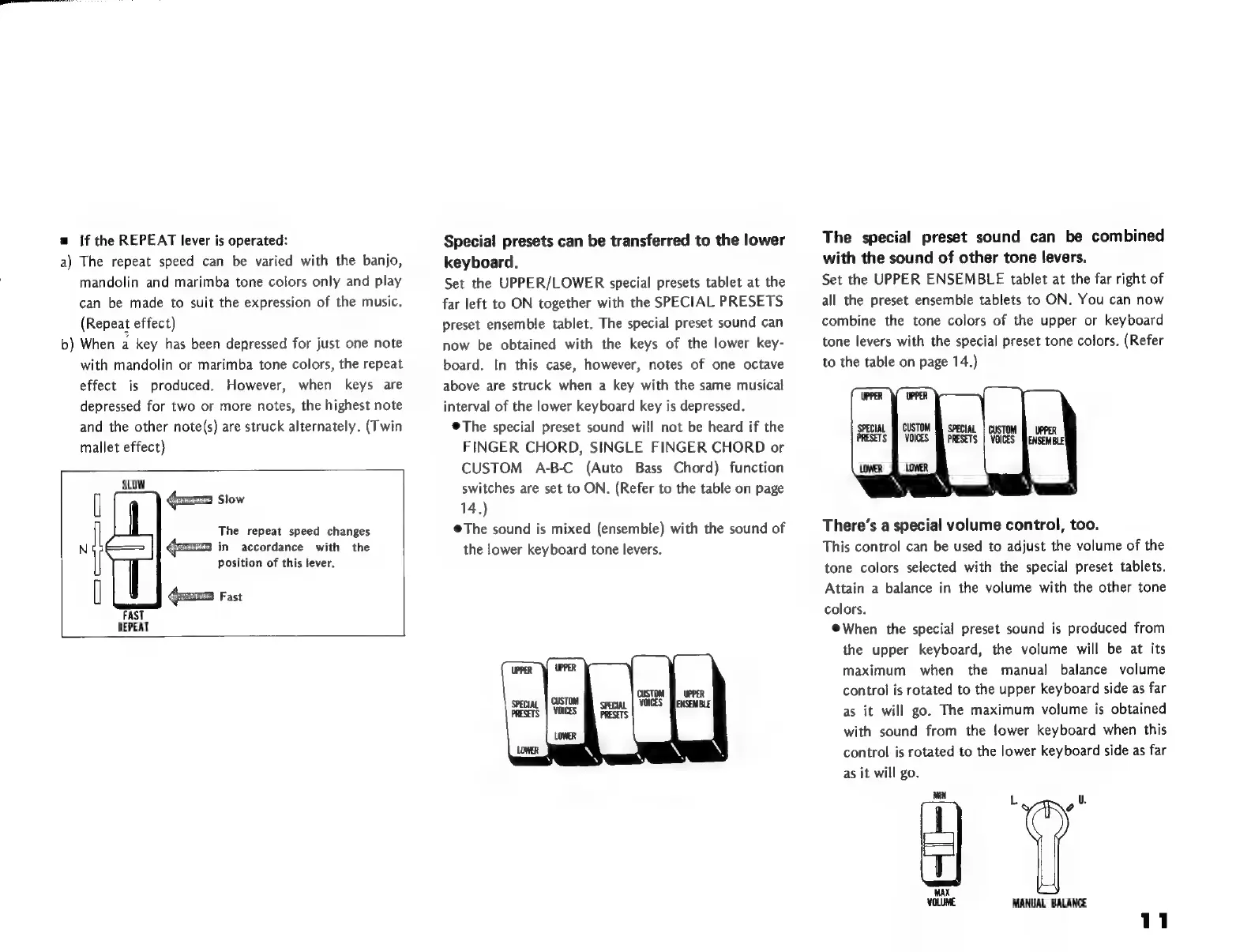 Yamaha D-85 - Special Preset Combinations; Transferring Presets to Lower Keyboard; Mixing Presets with Tone Levers; Special Preset Volume Control