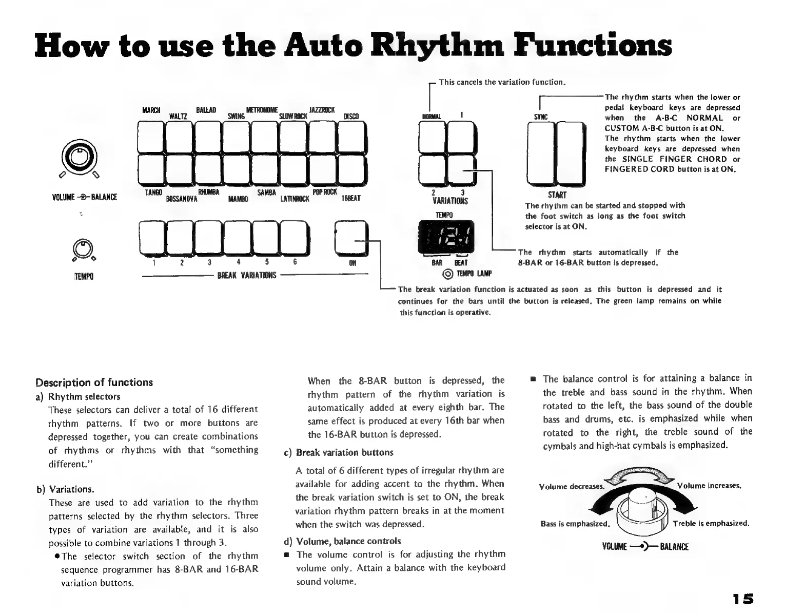 Yamaha D-85 - Auto Rhythm Functions; Rhythm Selectors and Variations; Break Variations and Volume Control