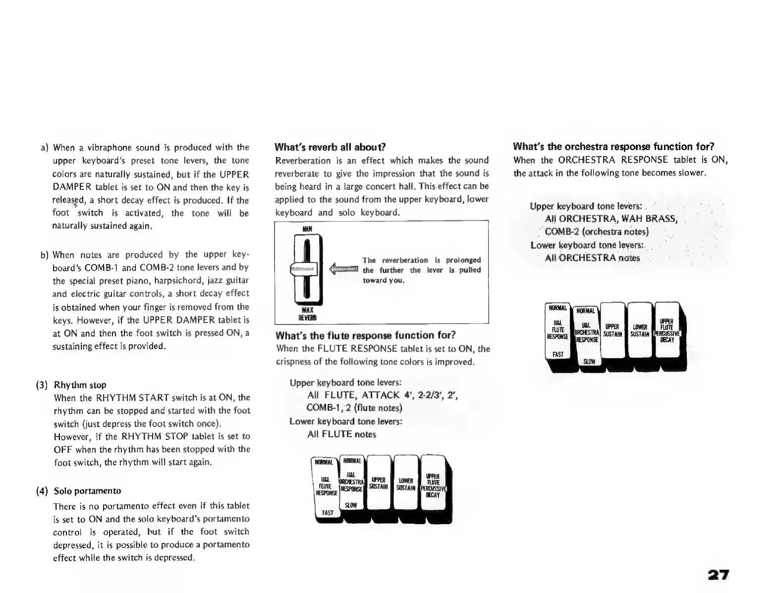 Yamaha D-85 - Rhythm, Portamento, and Tone Response Controls; Rhythm Stop and Solo Portamento; Reverb, Flute, and Orchestra Response