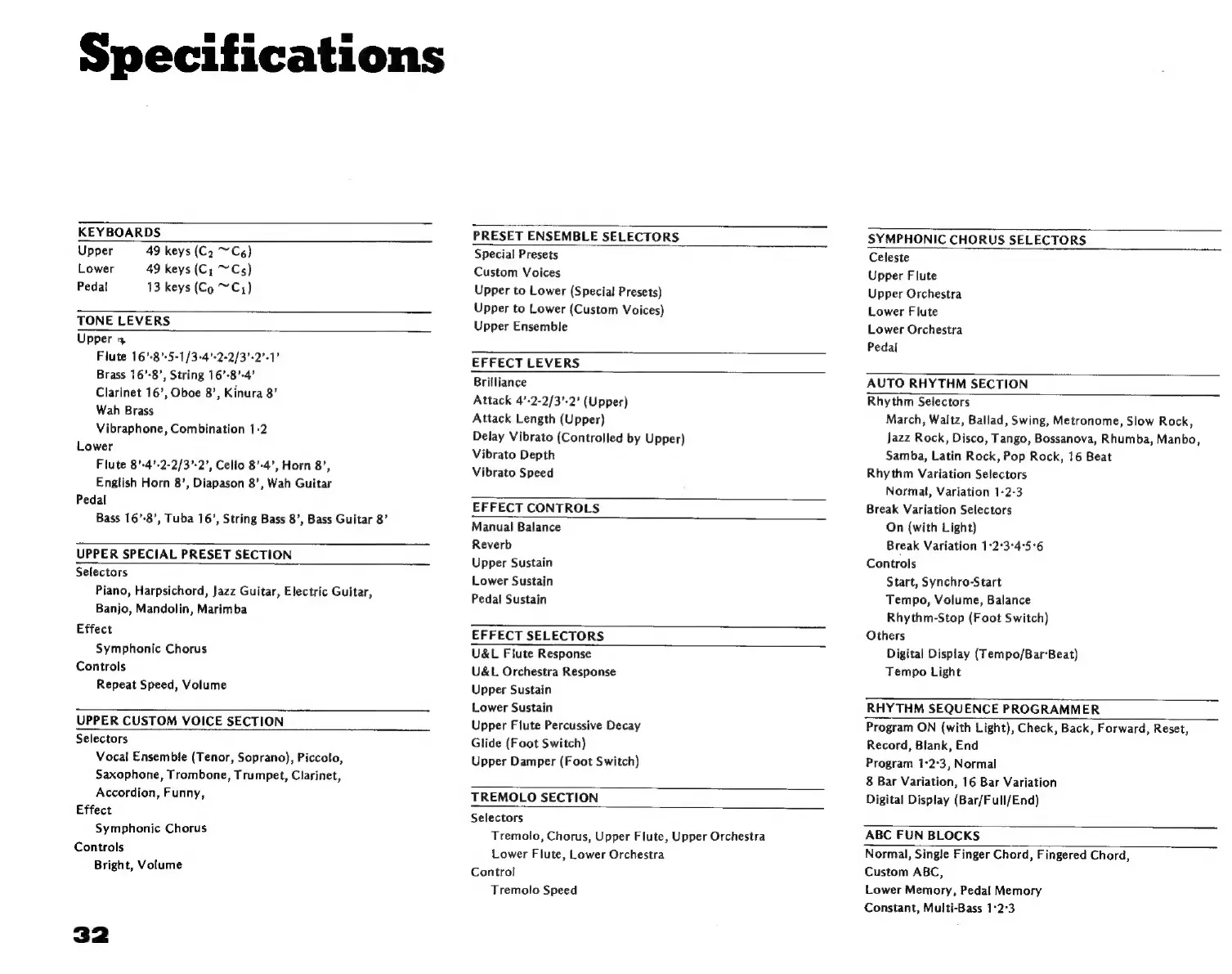 Yamaha D-85 - YAMAHA D-85 Component Specifications; Rhythmic Chord and Arpeggio Specs; Foot Switch and Control Specifications; Amplification, Dimensions, and Wiring