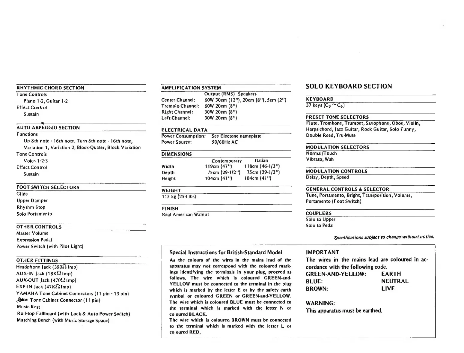 Yamaha D-85 - Solo Keyboard and System Specifications; Solo Keyboard and Modulation Specs; System, Power, and Wiring Information