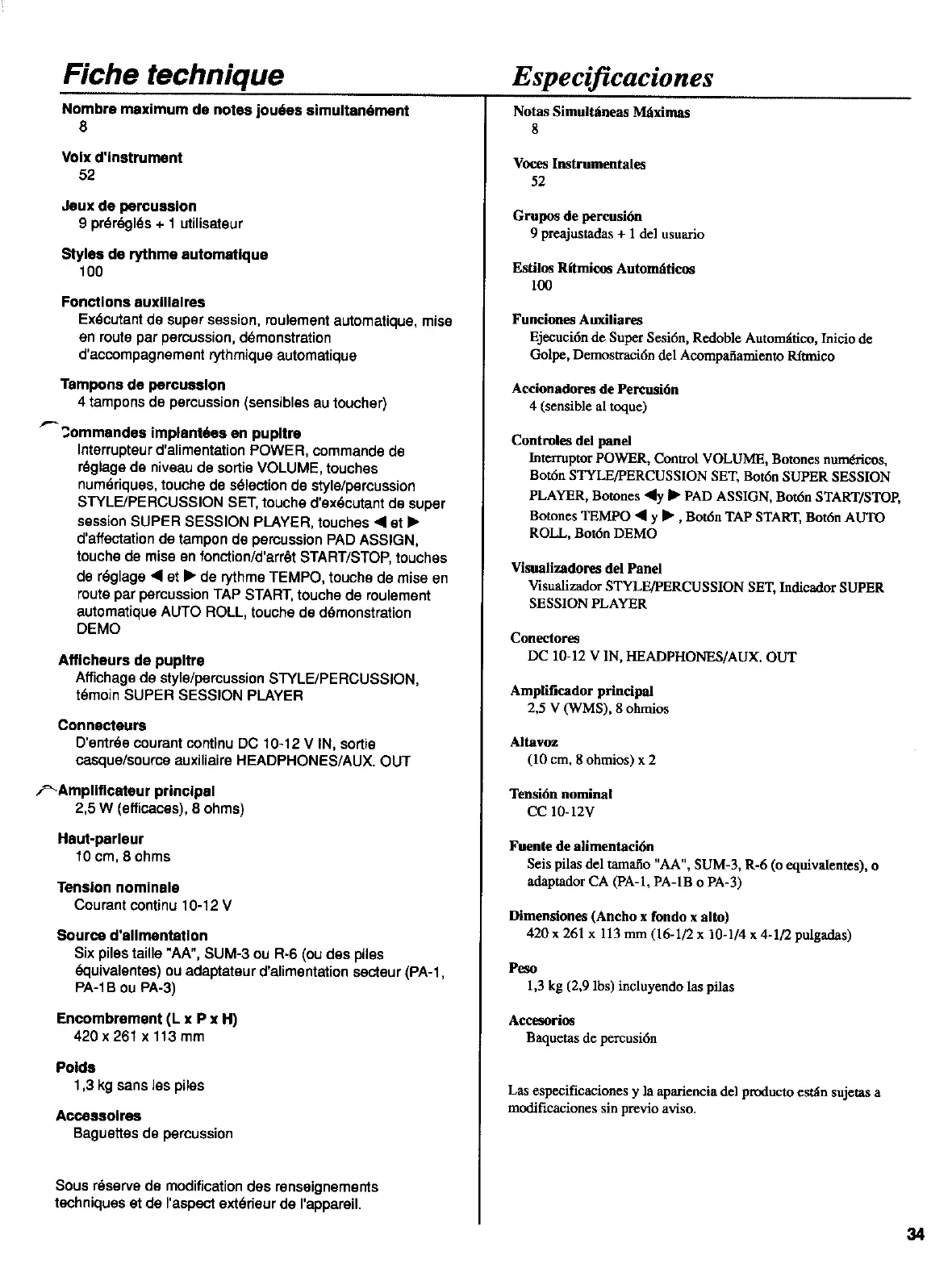 Yamaha DD-7 - Technical Specifications; Product Specifications Overview