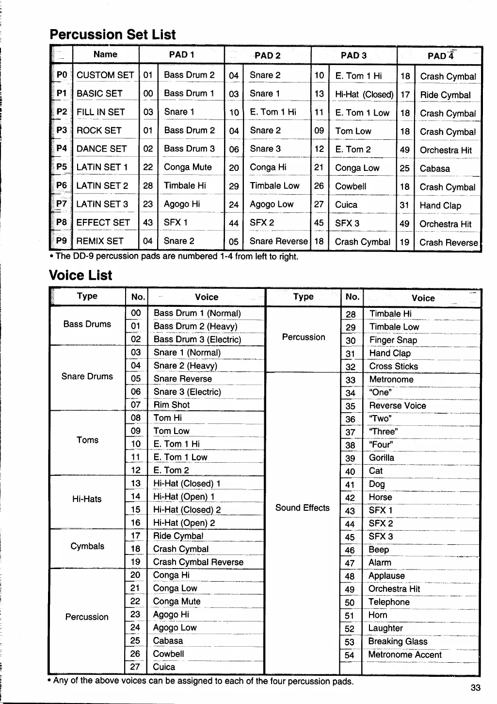 Yamaha DD-9 - Reference Information; Percussion Set Combinations; Voice Library Details