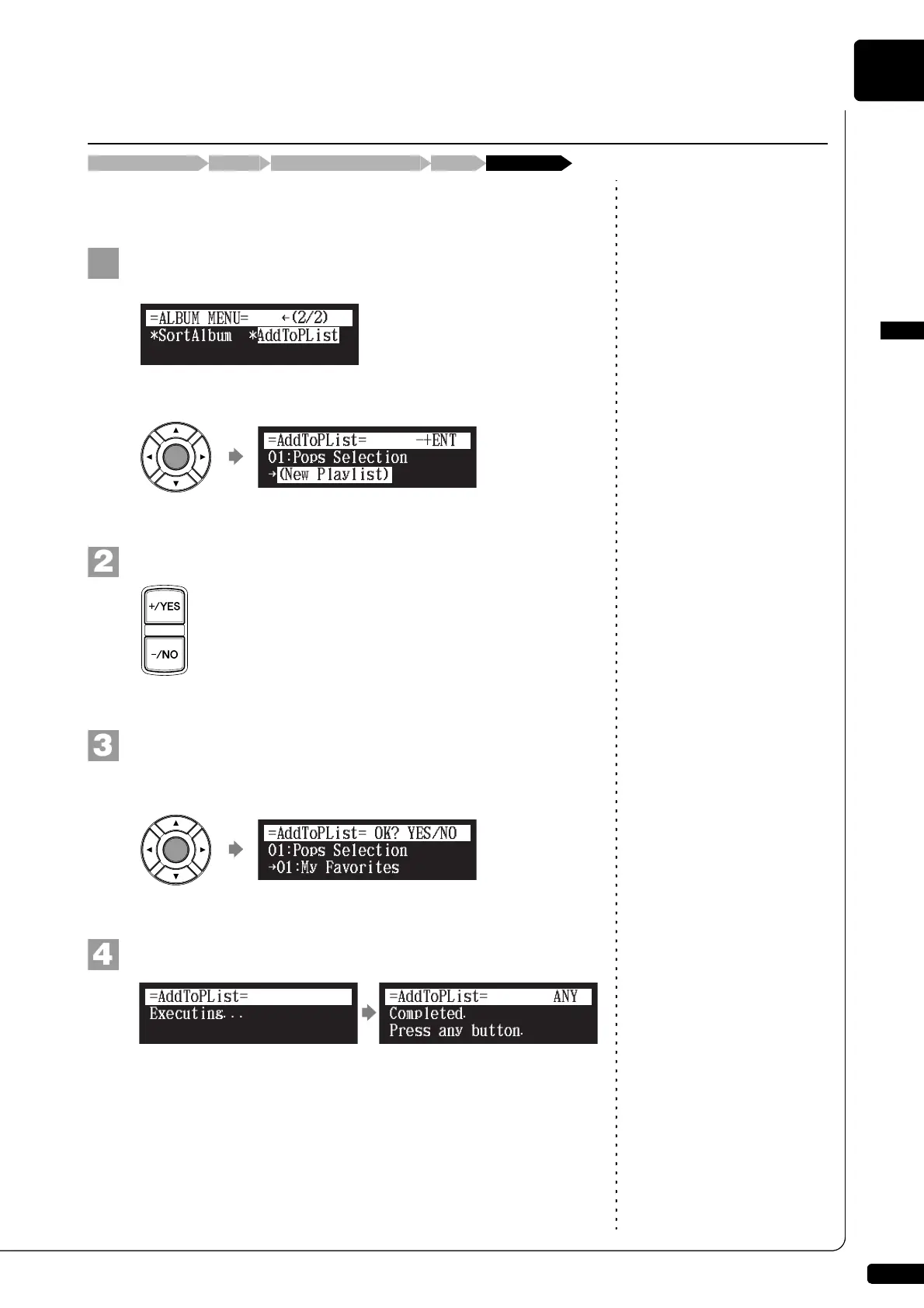 [FUNC.]Media selection screen “AddToPList”Album or song selection screen“Memory”