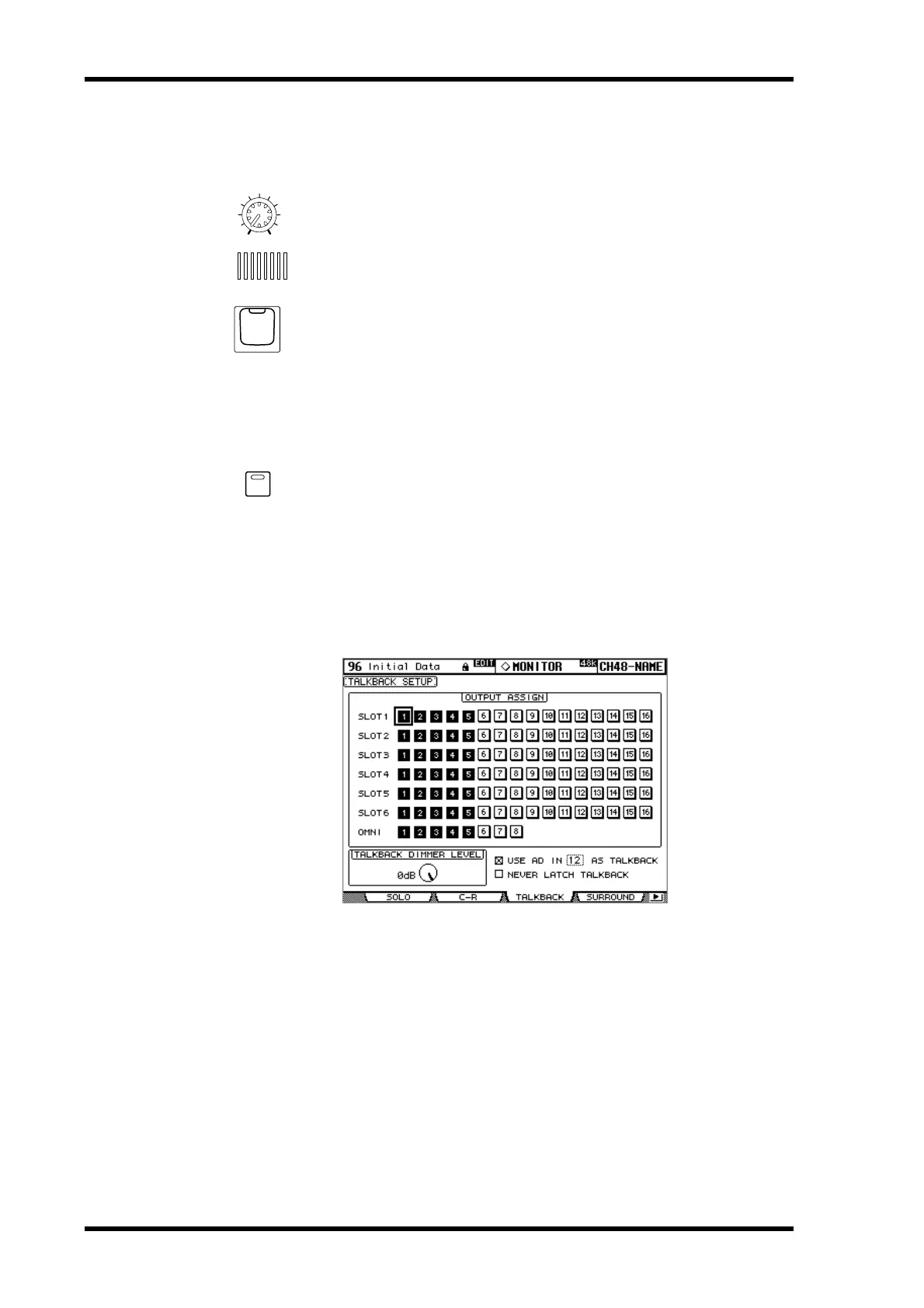 OUTPUT ASSIGN: These buttons are used to assign the Talkback mic signal to Slot and