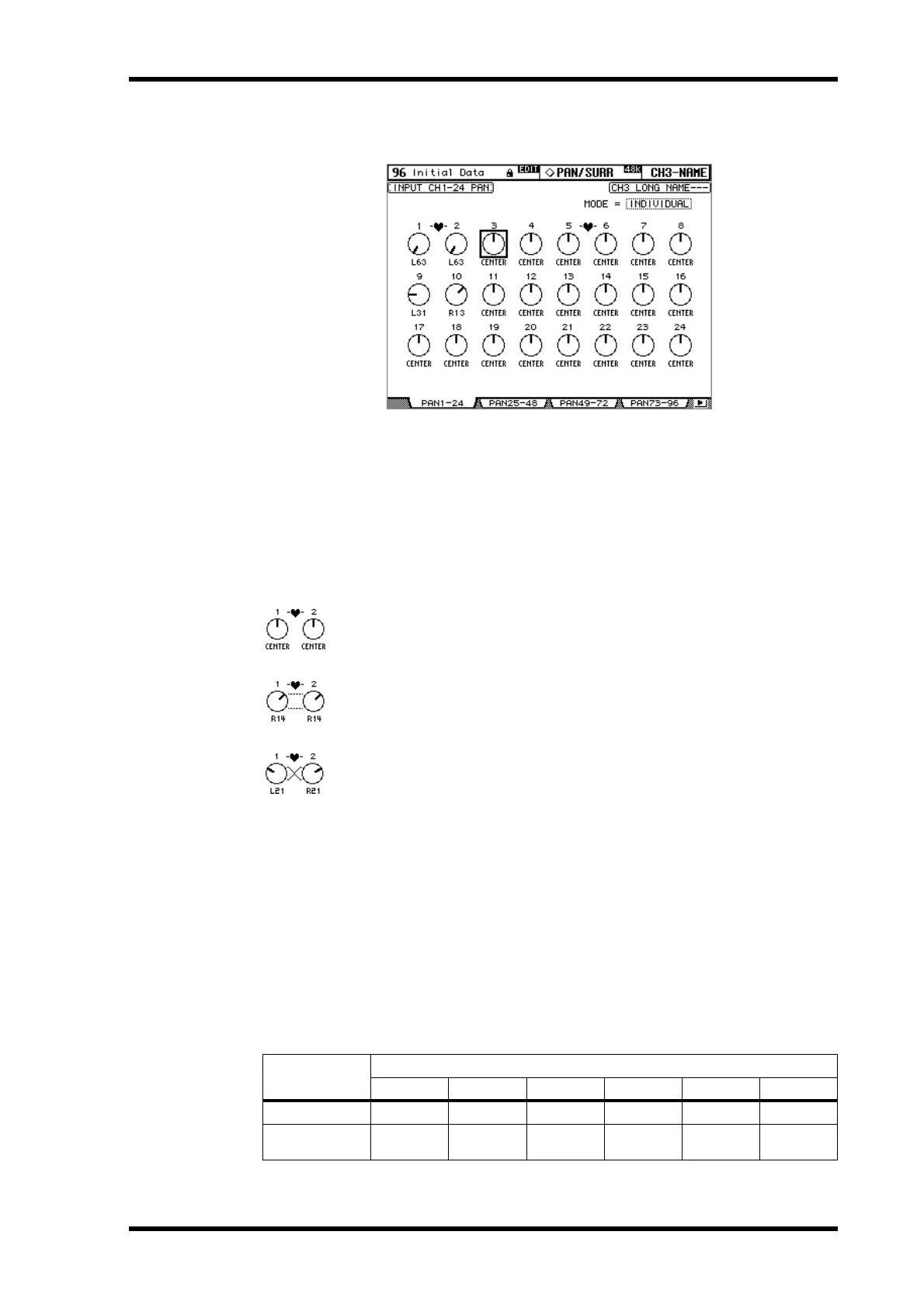The Pan parameters for the 96 Input Channels are arranged into four pages. The Input