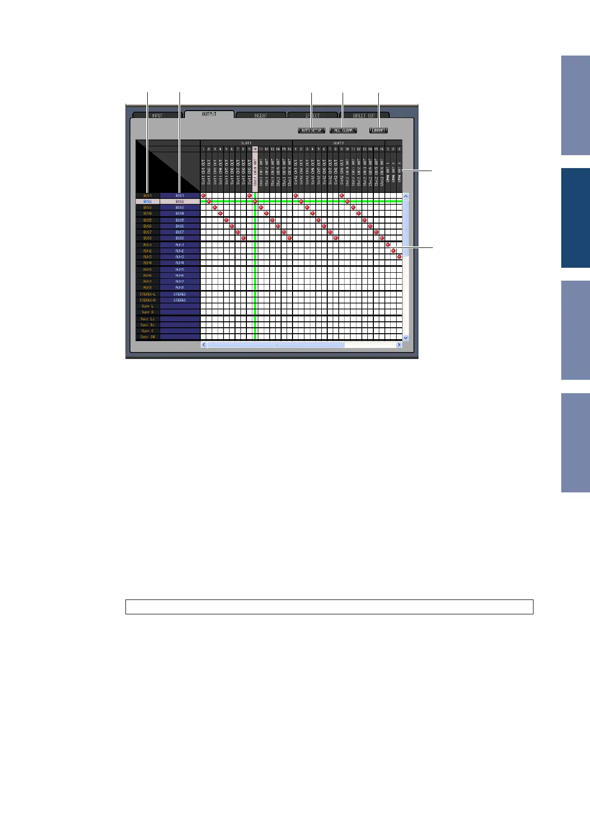The patchbay enables you to patch output ports to Output Channels. Active patches are indicated by