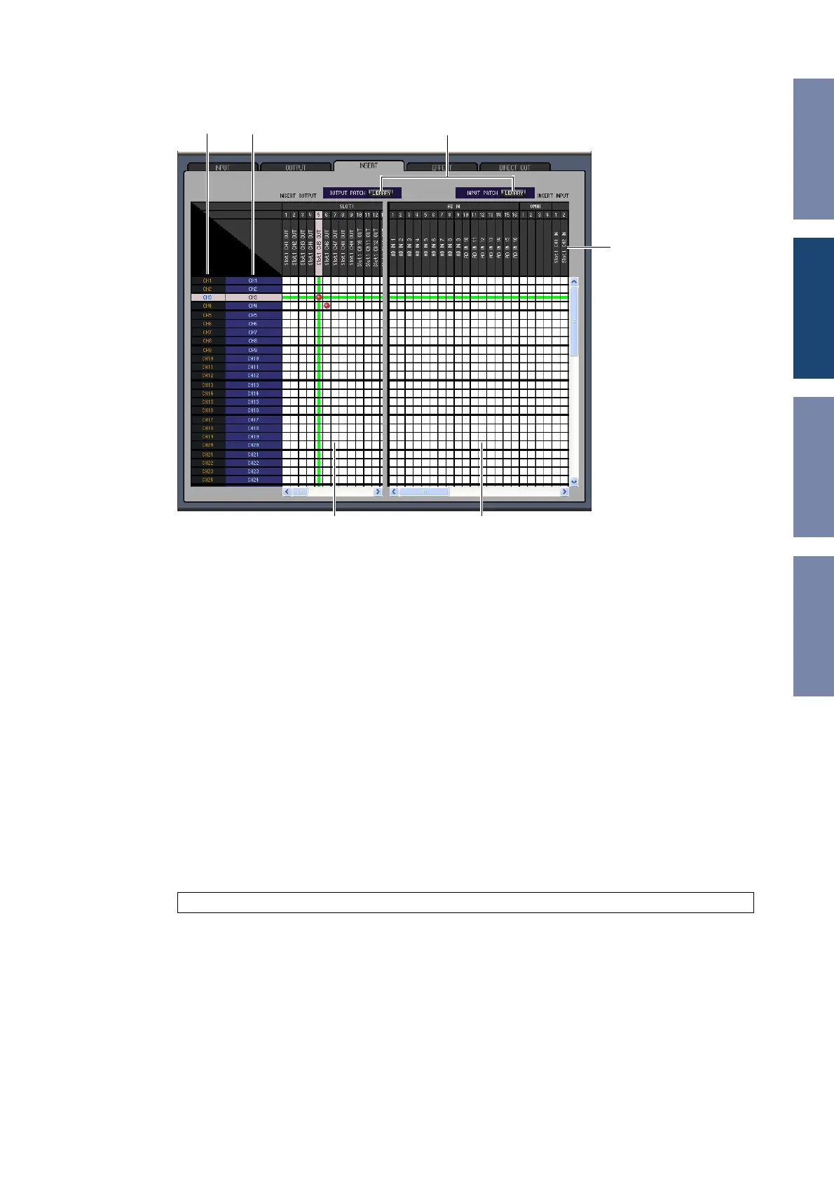 This patchbay is used to patch input ports to the Insert Ins of Input Channels, Bus Outs, Aux Sends,